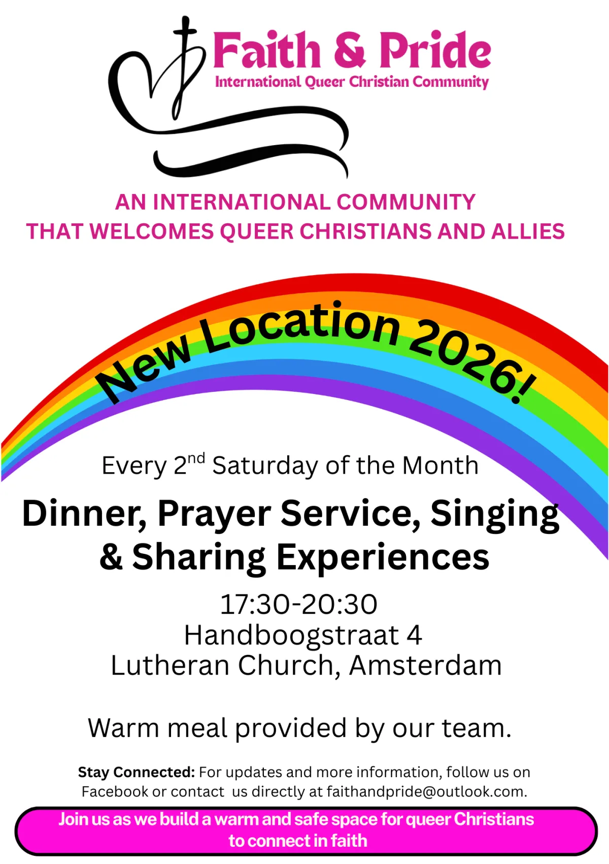 Faith & Pride is an English-speaking community church in Amsterdam. It is a space where LGBTQIA+ people of faith, including asylum seekers, come together to experience God’s love, grow spiritually and find strength in each other. It has three main values: hospitality, sharing and experiencing faith together. Through food, song, prayer, fellowship and God's word, we celebrate the diversity of God’s love for us all.